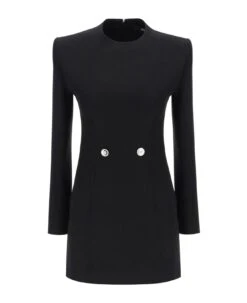This Versace long-sleeved mini dress boasts an hourglass silhouette enhanced by structured and padded shoulders. Cut from pure virgin wool grain de poudre in a crew-neck design, it is embellished with Medusa buttons at the cuffs and front waist. Back invisible zip closure, full lining. The model is 177 cm tall and wears a size IT 40.