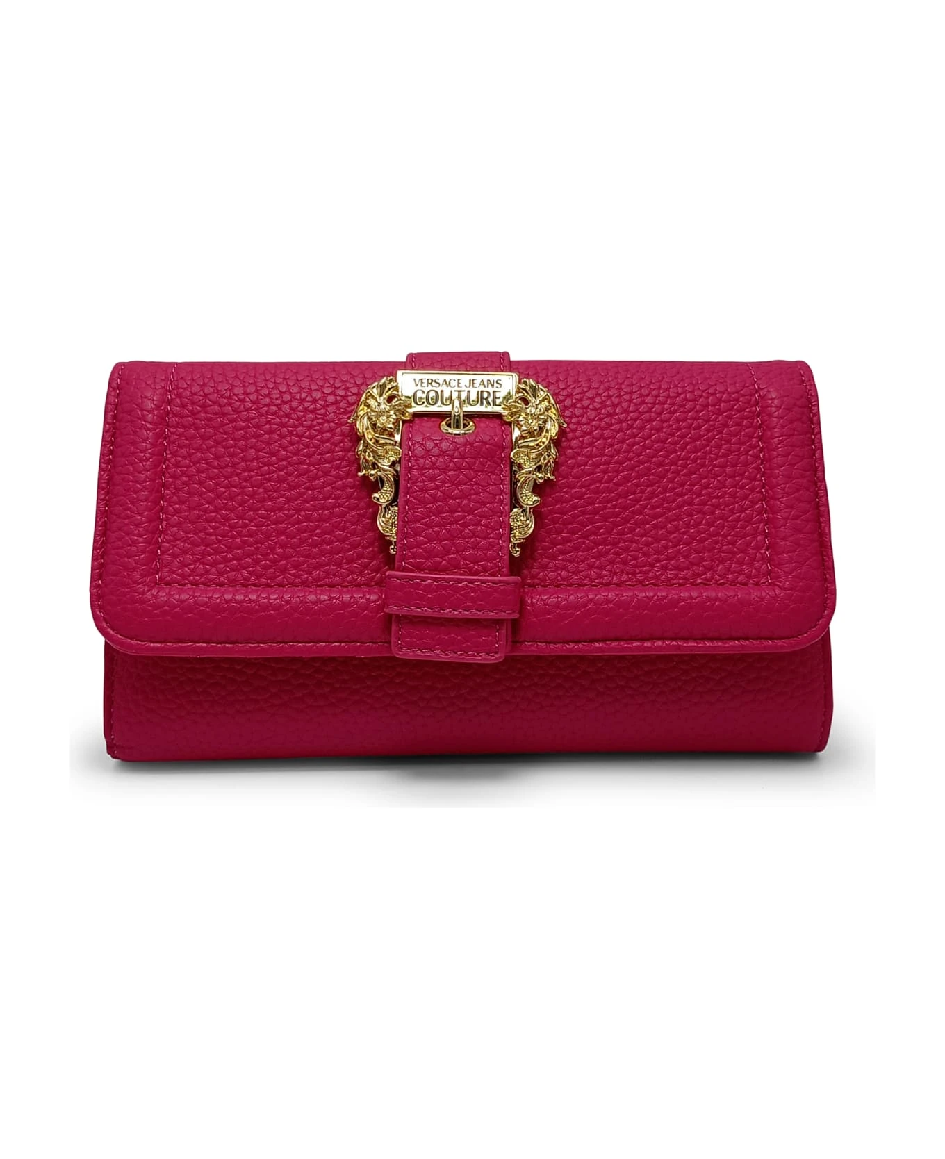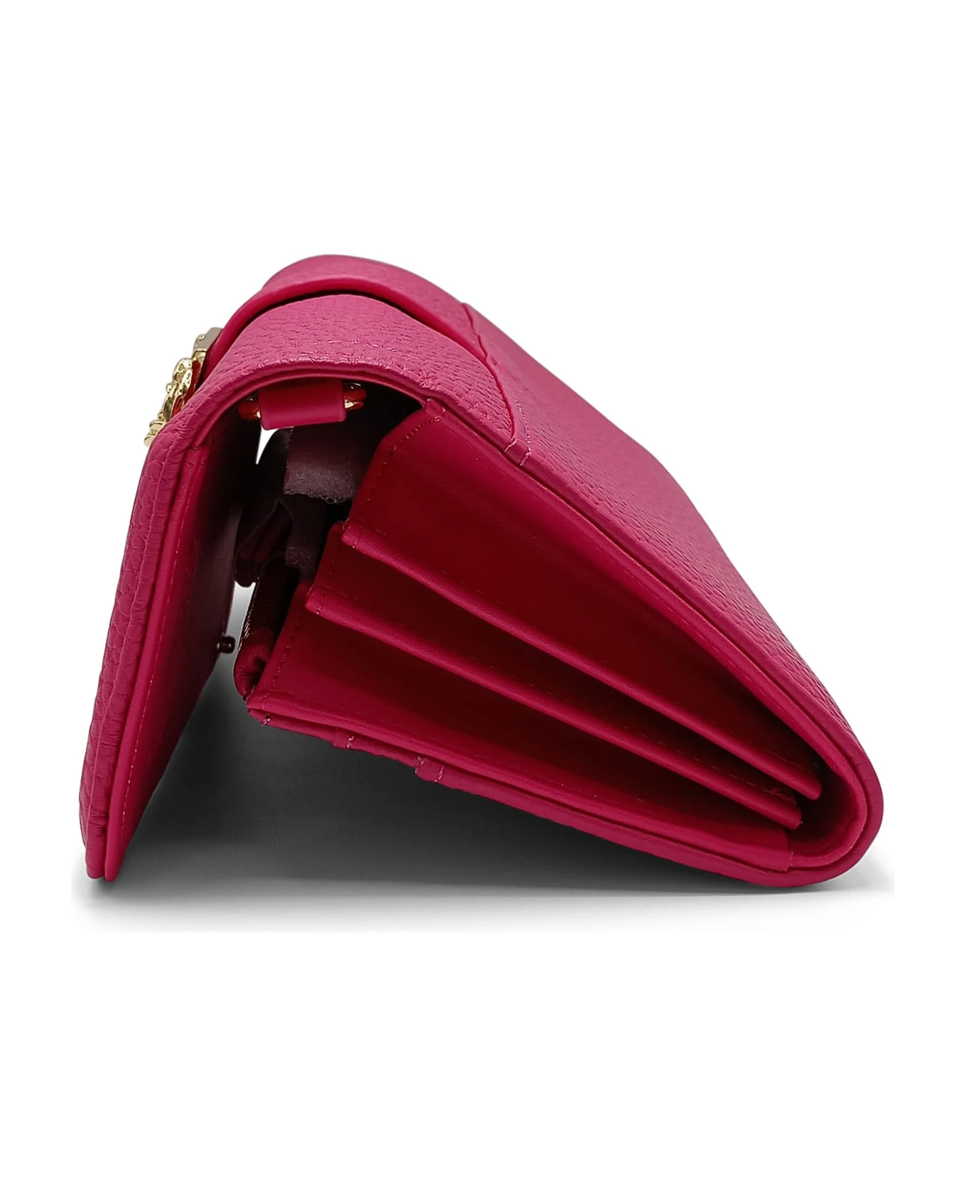 pelle cruelty-free, dettagli color oro, battente nella parte superiore con chiusura magnetica, fessure portacarte interne e tracolla a catena.