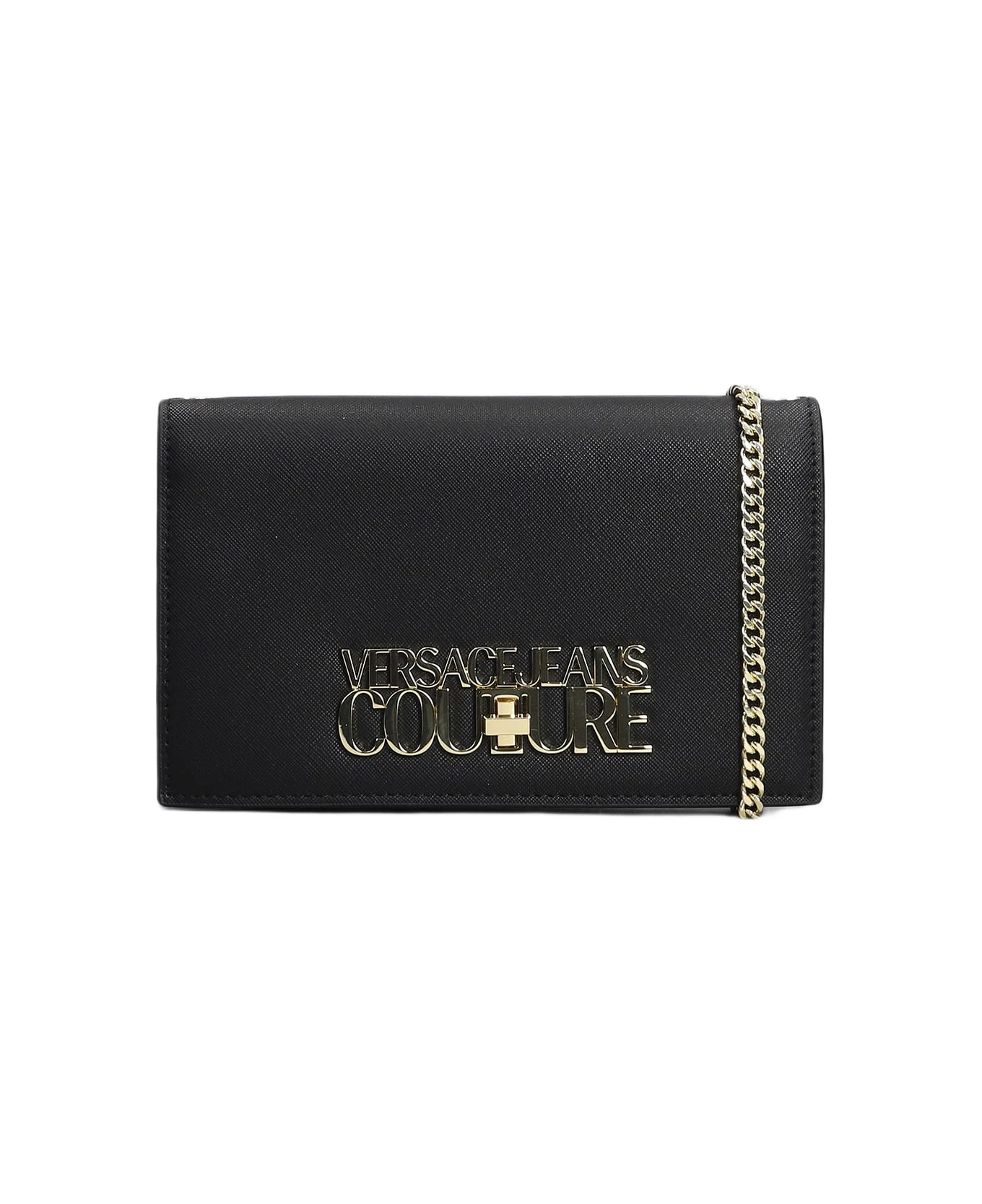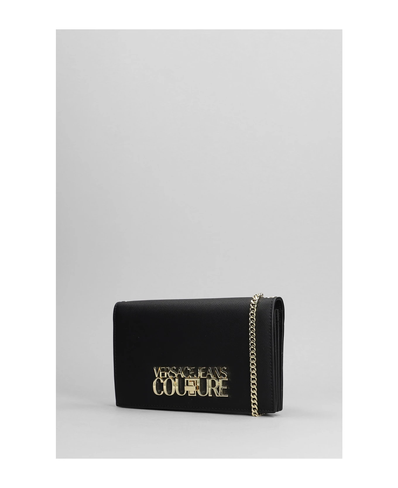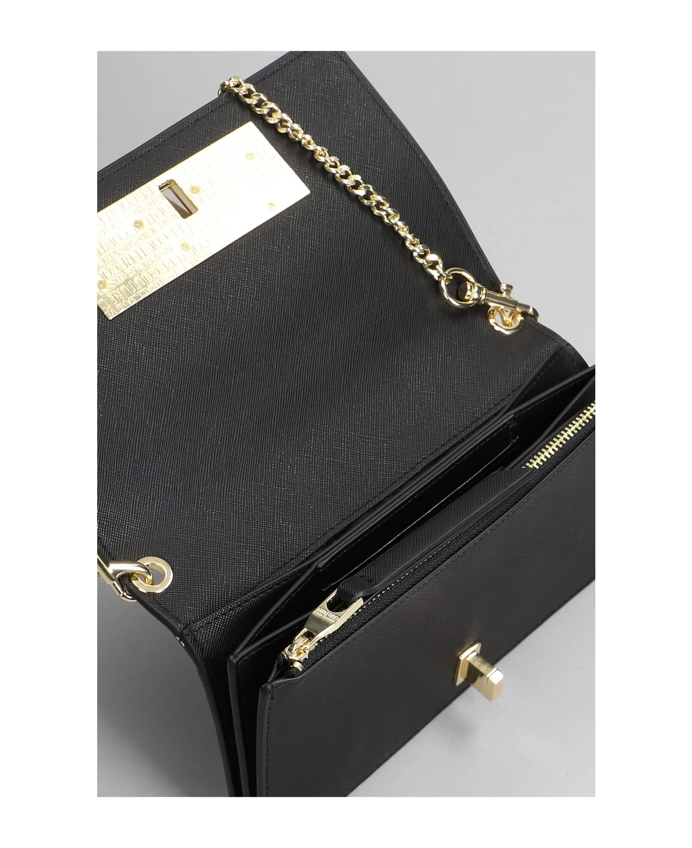 Clutch in black faux leather, gold hardware, shoulder strap, metallic logo, 100% artificial leather, turn lock, Made in China, Height 125 mm, Width 200 mm