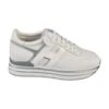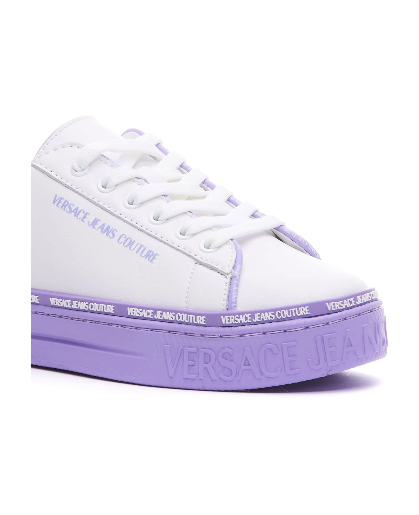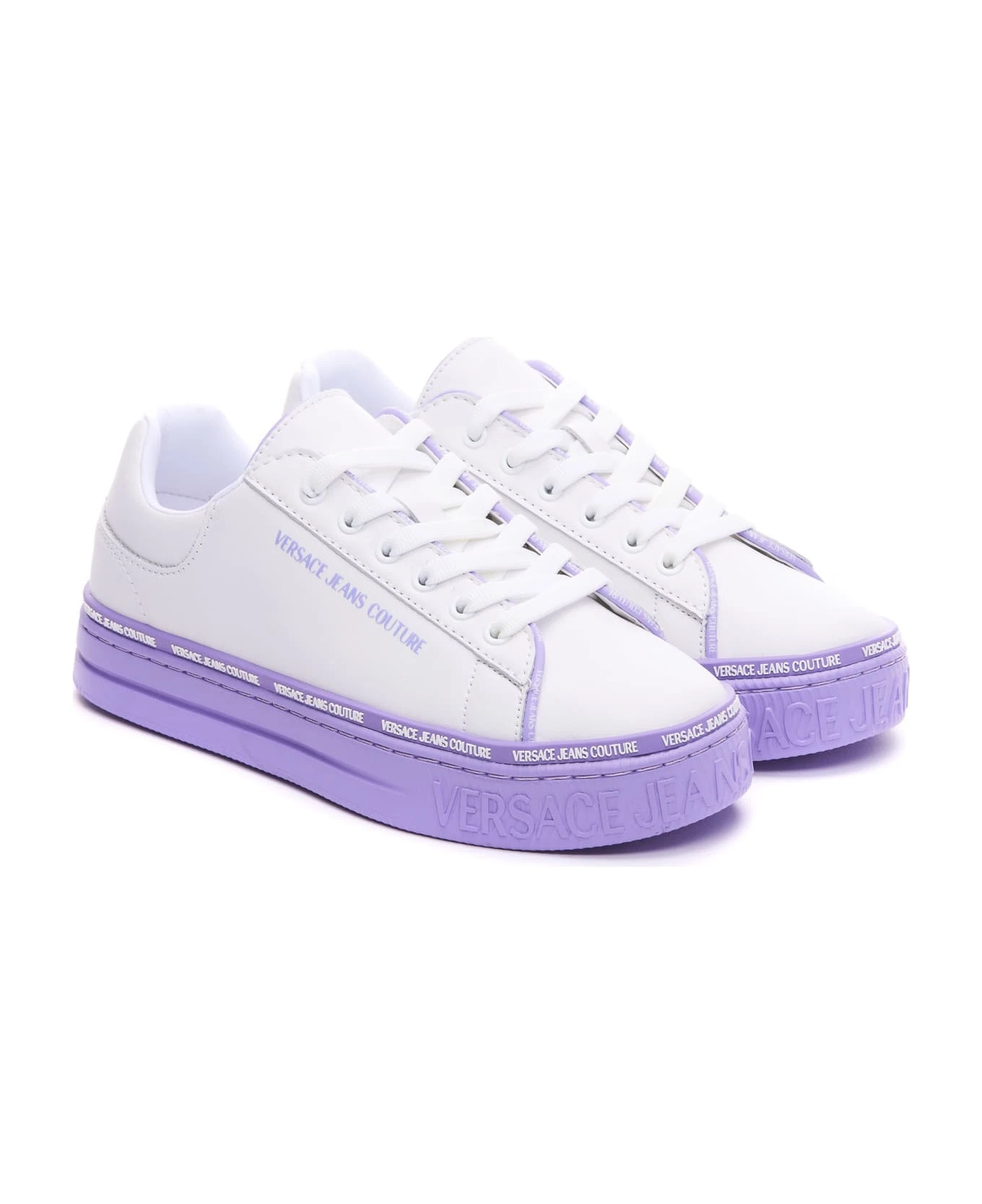 Versace Jeans Couture white and lilac logo sneakers, round toe, leather upper and rubber sole, colourblock, frontal and lateral logo, logo on sole, lace closure