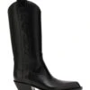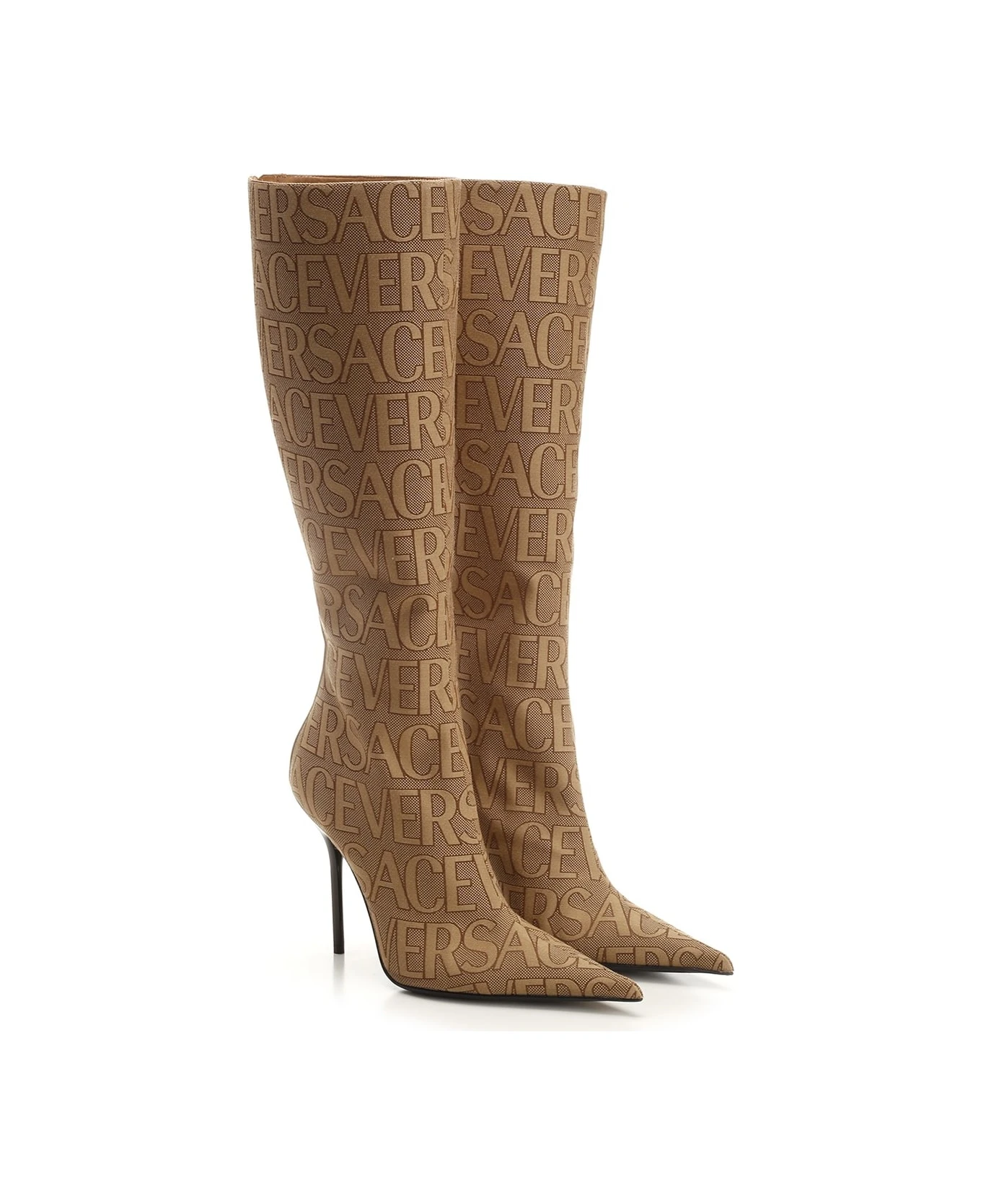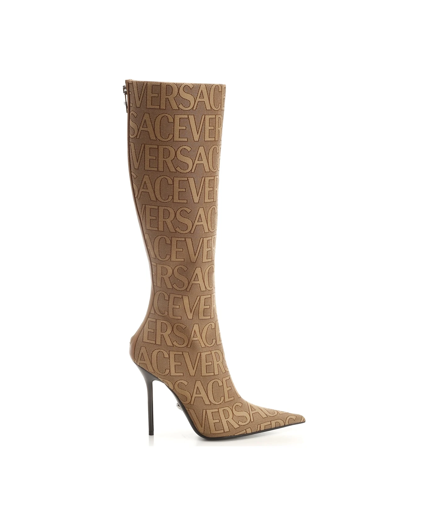 Knee-high boot by Versace in Allover jacquard canvas with leather details and stiletto heel