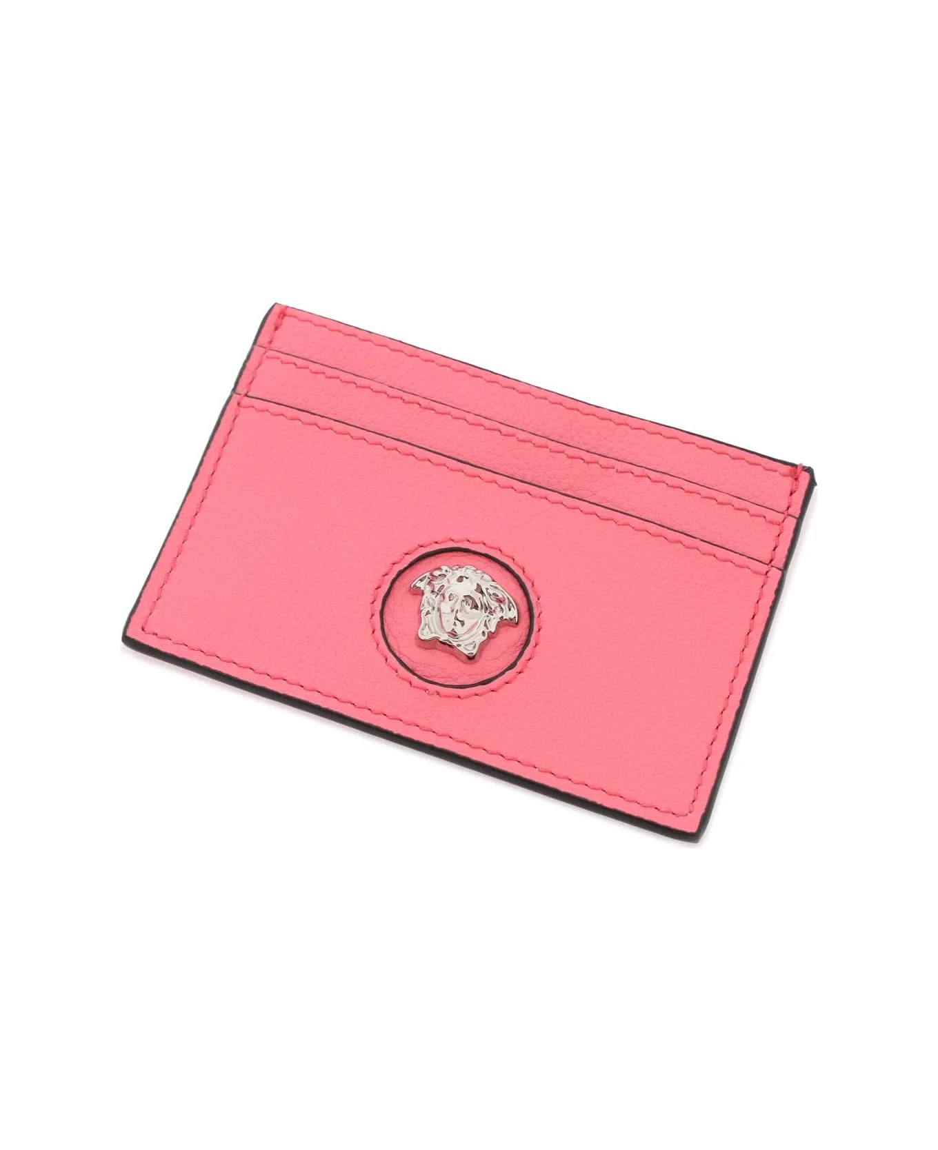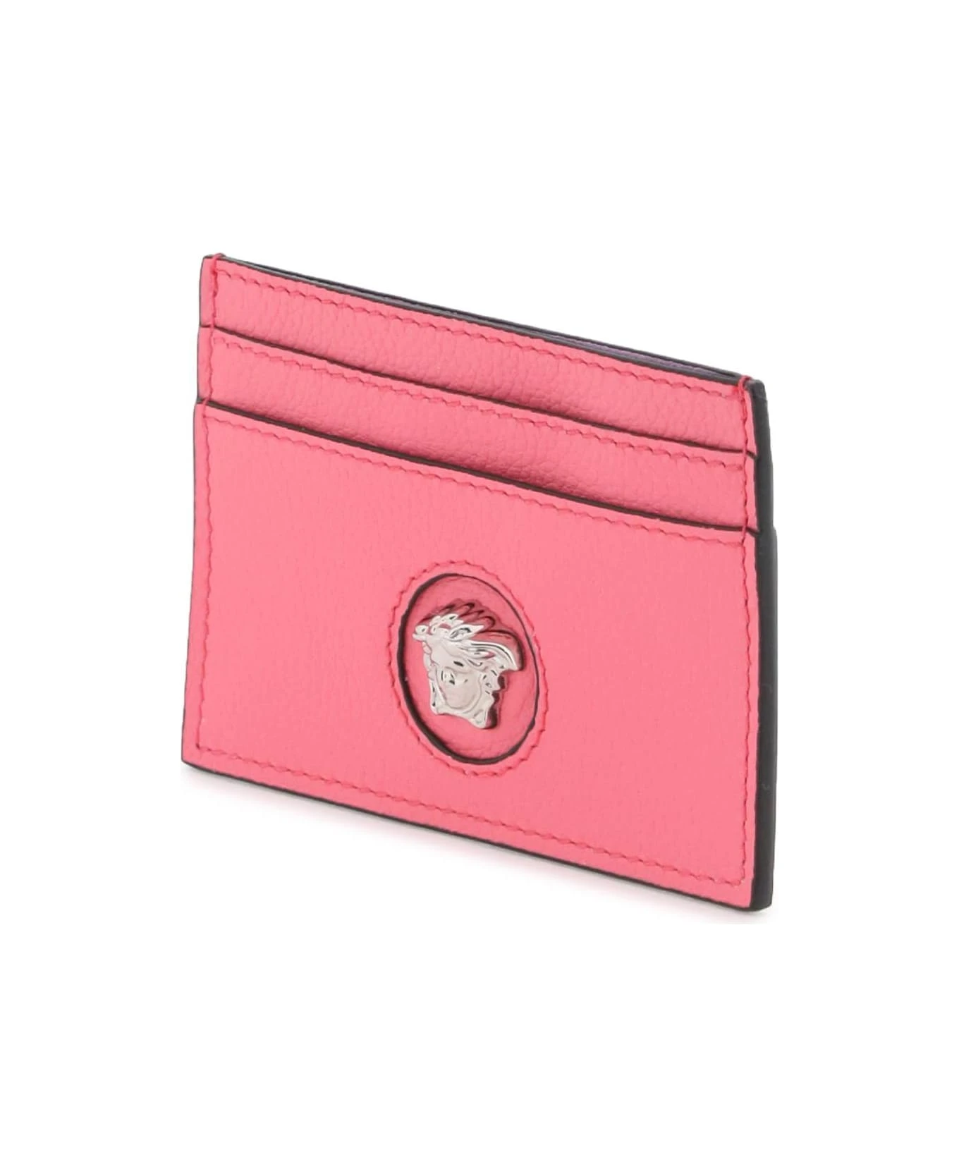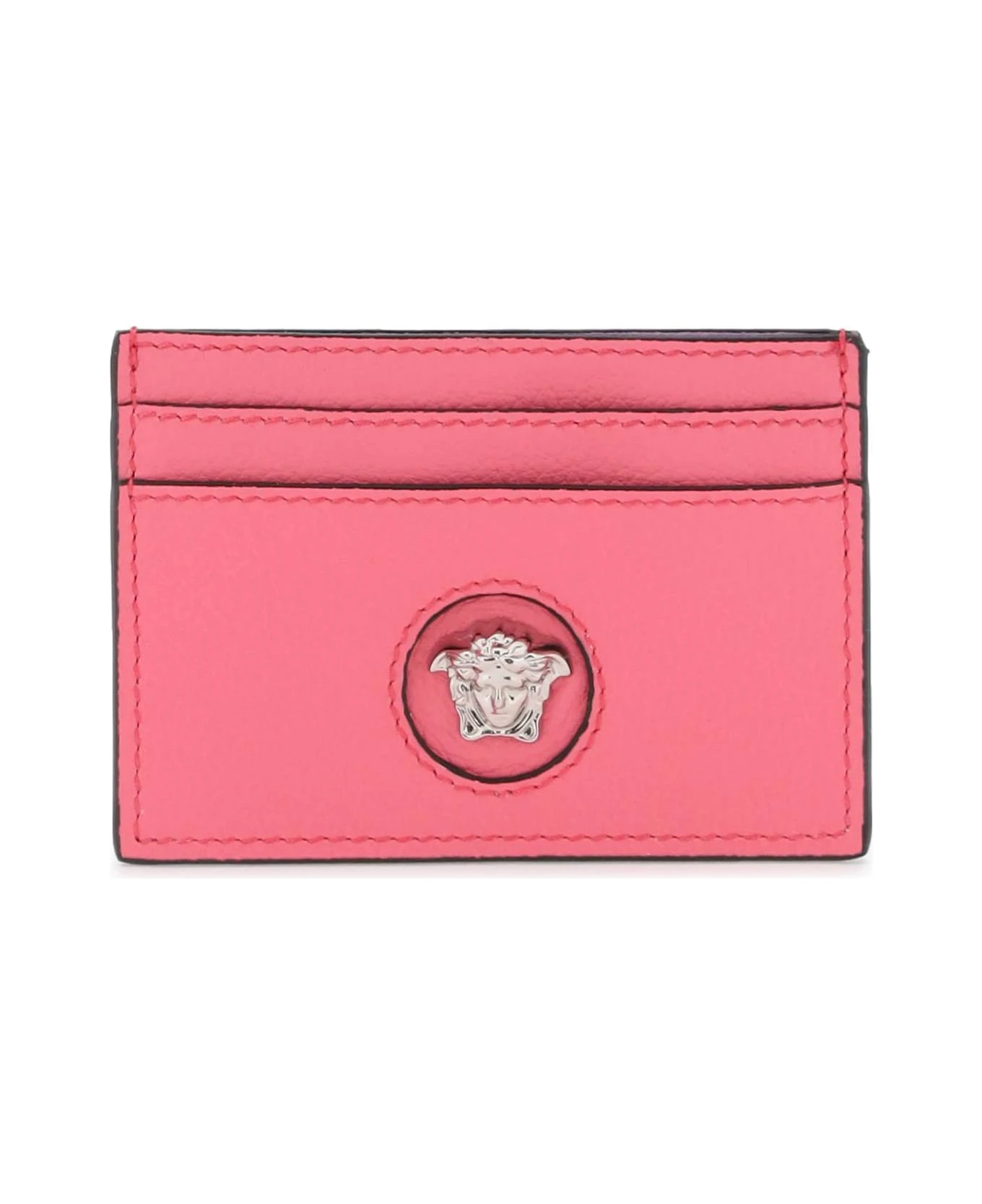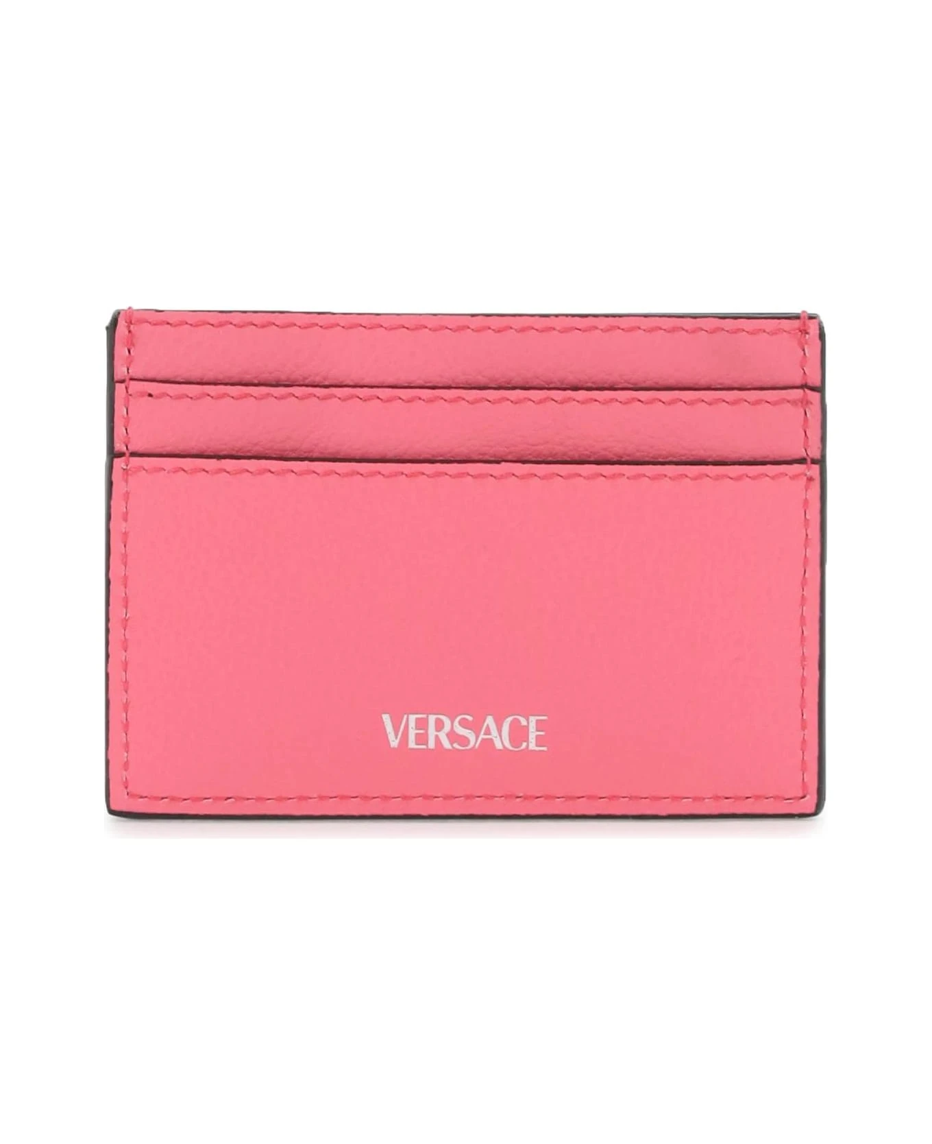 Versace cardholder in grained leather characterized by the iconic silver-finished Medusa head plaque applied on front. Silver-tone lettering logo print on the back, two credit card slots on each side and a leather-lined central flat pocket.