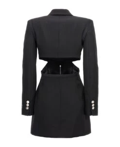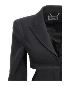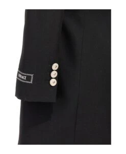La Vacanza capsule single-breasted blazer in wool with Gianni ribbon details, Medusa metal elements, zip and button closure, long sleeves, cut out detail at the back.