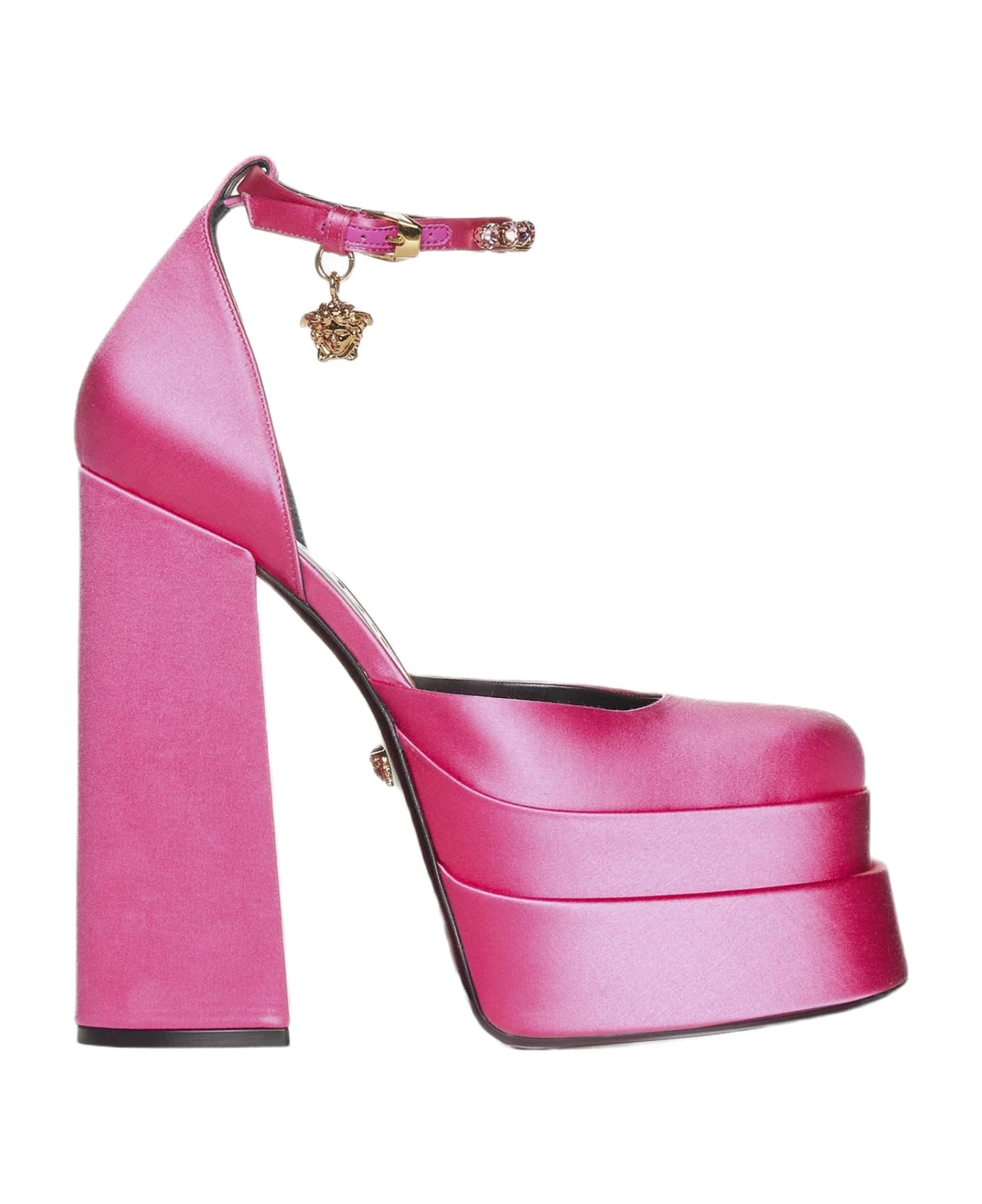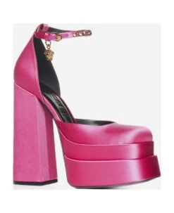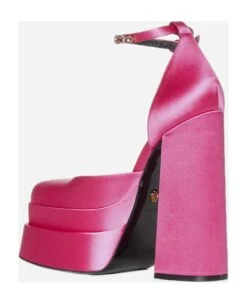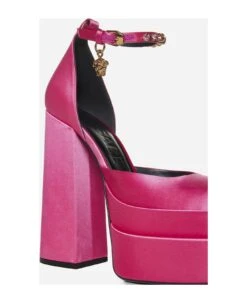 Versace’s Medusa Aevitas pink satin pumps featuring a thin ankle strap with decorative crystals and gold-tone buckle with Medusa charm, round toe, double platform, high block heel and leather sole with Medusa logo on the outsole.