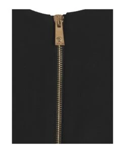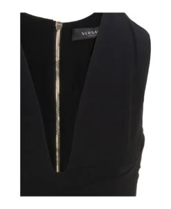 Crรชpe sleeveless midi dress with wide V-neck, ‘Medusa Biggie’ adjustable belt and a back zip closure.