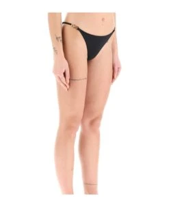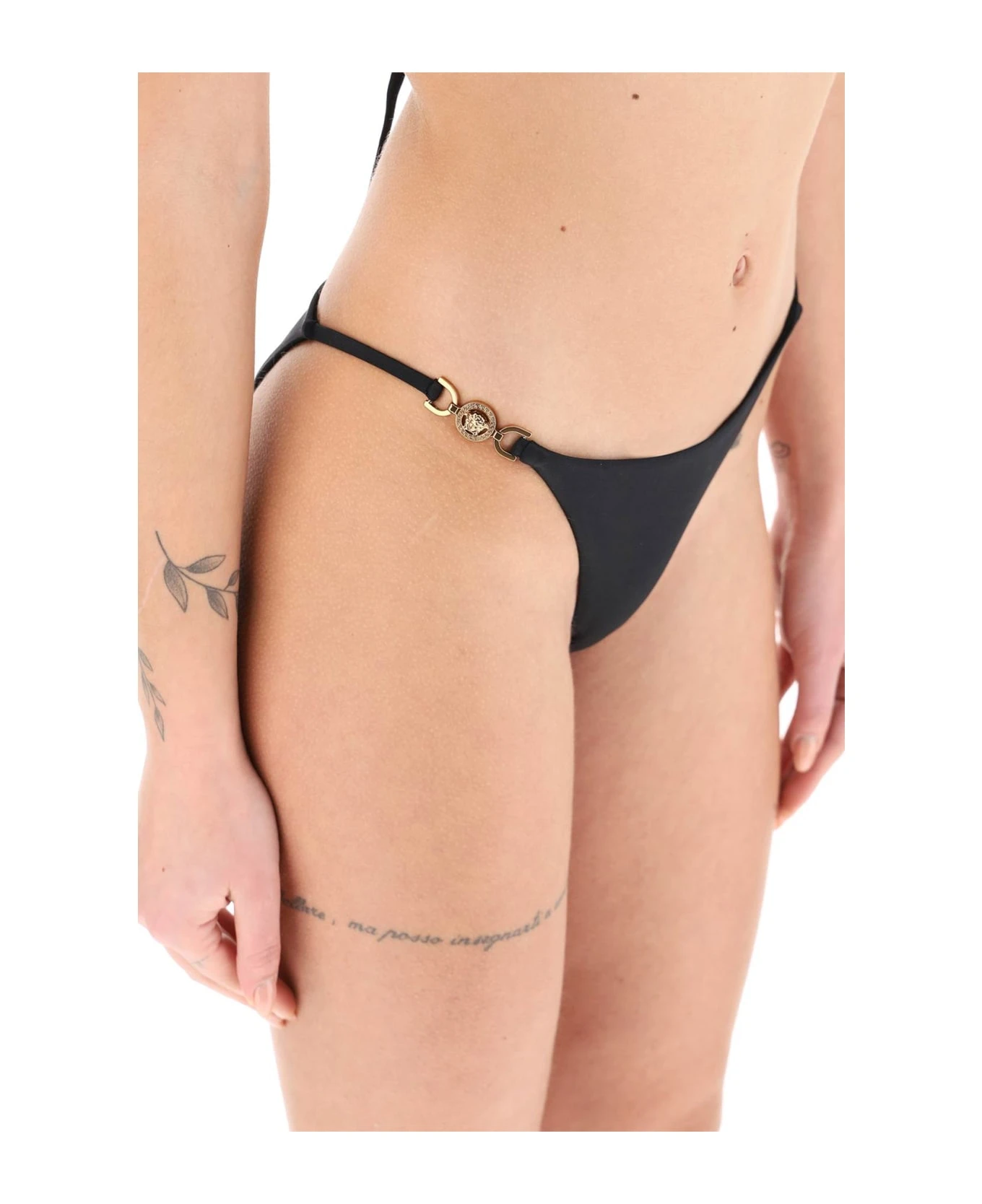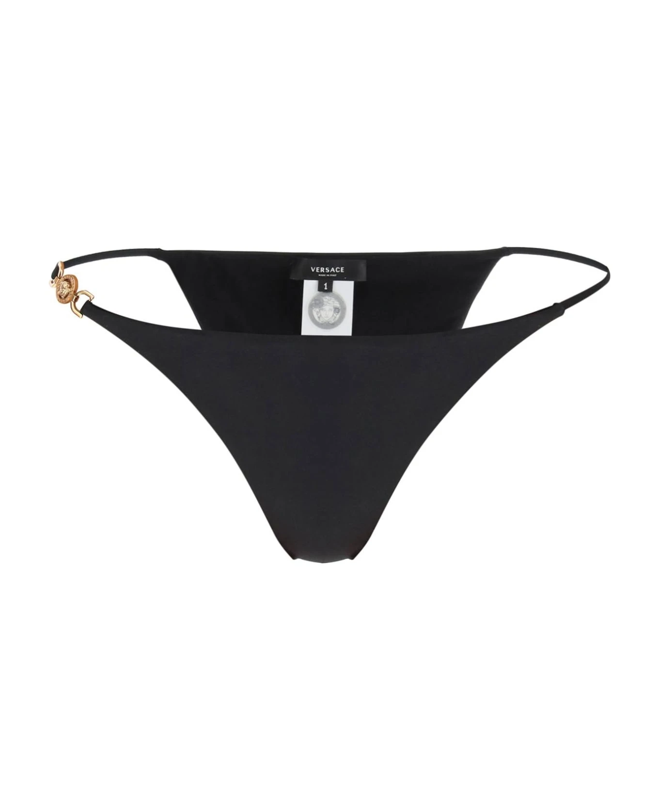 Lycra bikini bottom by Versace with thin side straps, embellished with the iconic gold-tone metal La Medusa detail. The model is 177 cm tall and wears a size 1.