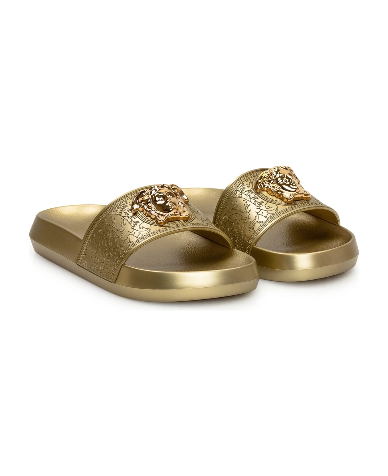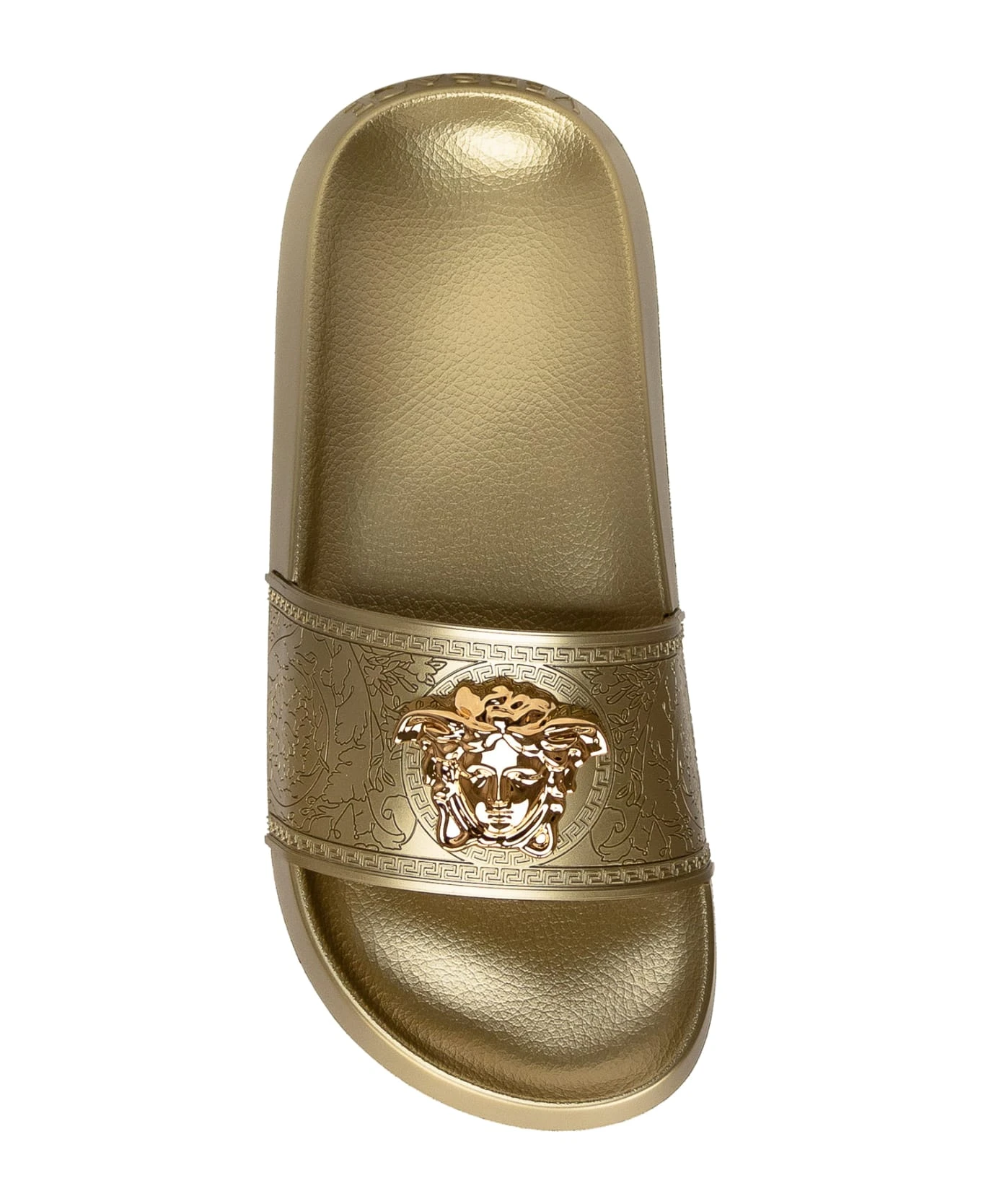 Golden slide. Metal Medusa on the mask. Barocco print. Logo on the heel.