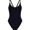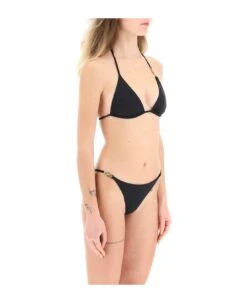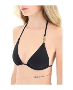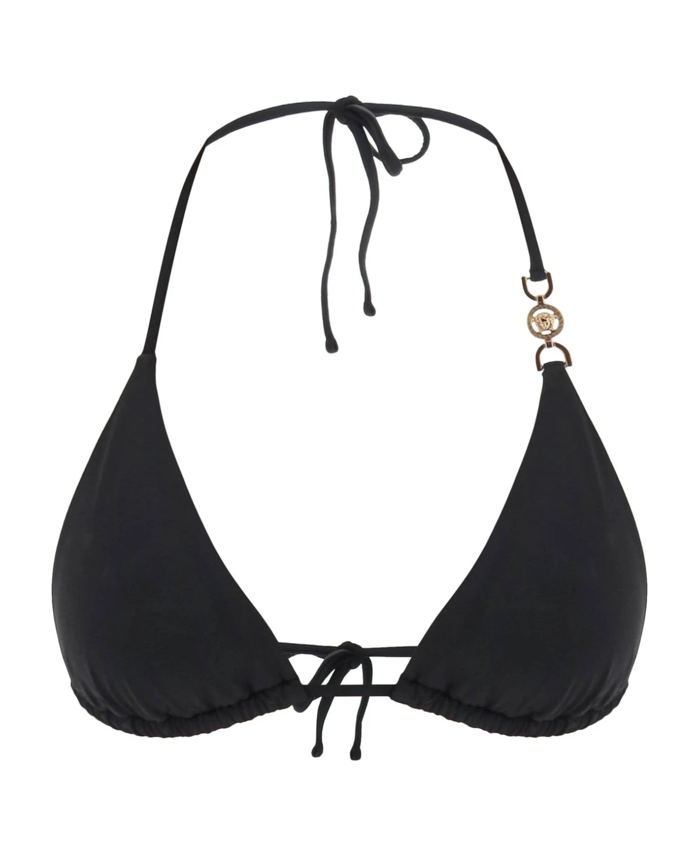 Lycra triangle bikini top by Versace embellished with the iconic gold-tone metal La Medusa detail. Fastened with self-tie straps at rear neck and on the back. The model is 177 cm tall and wears a size 1.