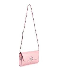 La Medusa crossbody bag in metallic leather by Versace with silver-tone metal Medusa embellishment on the flap. Magnetic button closure, removable leather shoulder strap, interior lined in cotton twill with a zip pocket and six leather card slots. Silver-finished metalware.