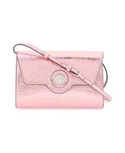 La Medusa crossbody bag in metallic leather by Versace with silver-tone metal Medusa embellishment on the flap. Magnetic button closure, removable leather shoulder strap, interior lined in cotton twill with a zip pocket and six leather card slots. Silver-finished metalware.
