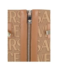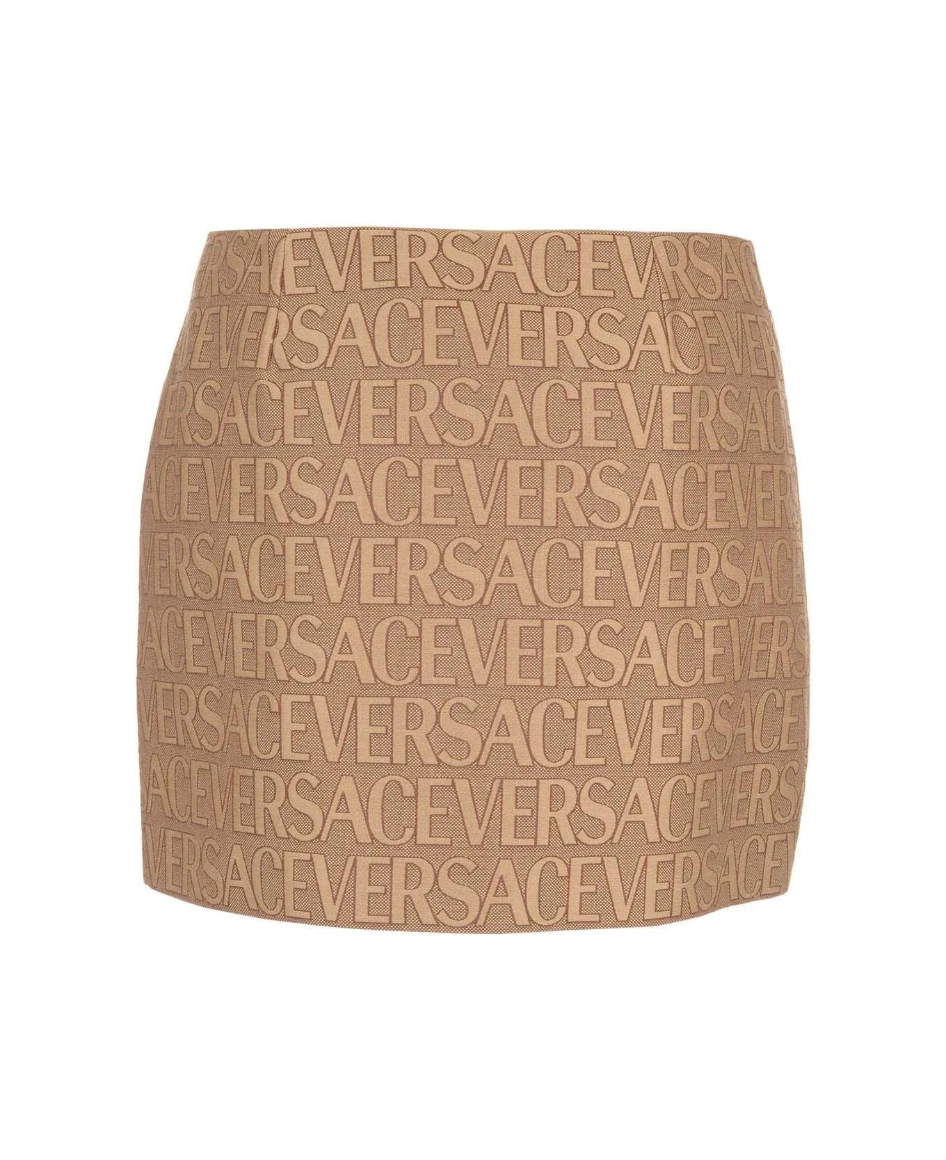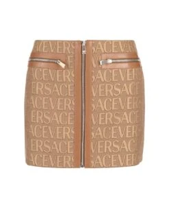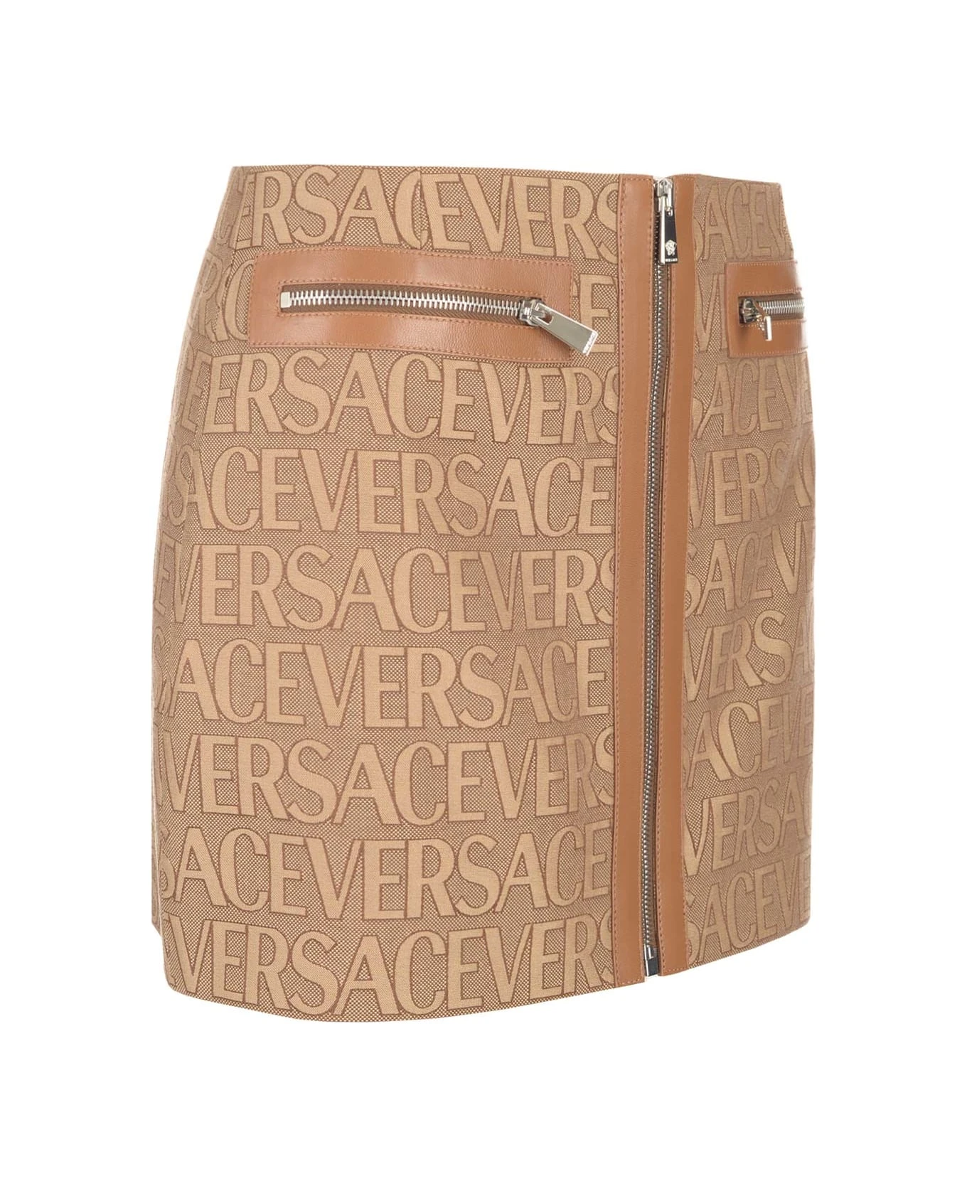 Stretch jacquard canvas miniskirt with all over logo from Versace, with leather trims, full-length zip, zip pockets.
