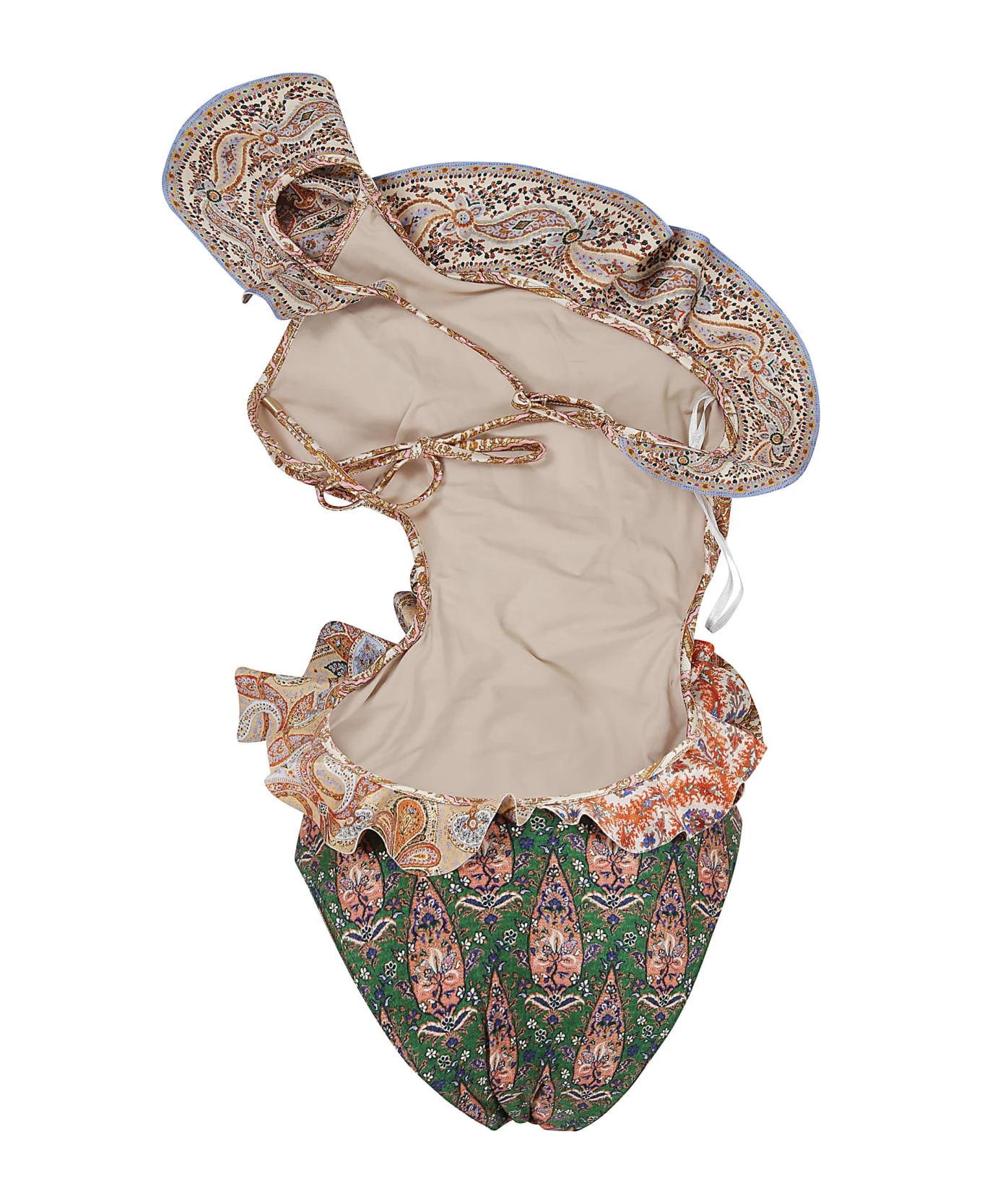 Devi Spliced Ruffle 1PC swimsuit in lycra BY ZIMMERMANN. One shoulder; back strap to tie. Frill detail.