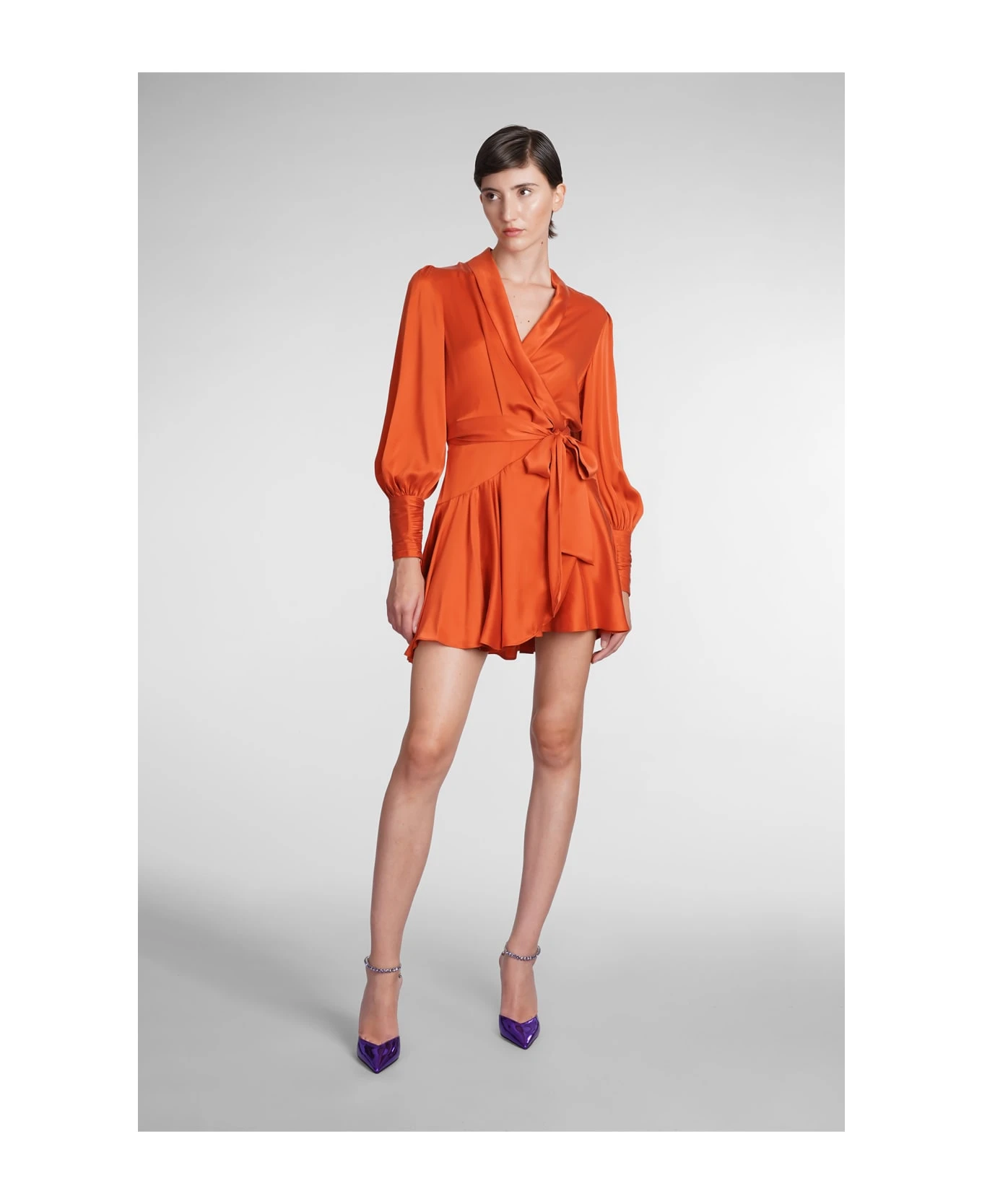 Dress in orange silk, short sleeves, ruffle neck, ruffles, belt waist, flower decoration, pockets, zip clousure, 55% linen, 45%silk, Made in China, Model is 180 cm and wears size 1