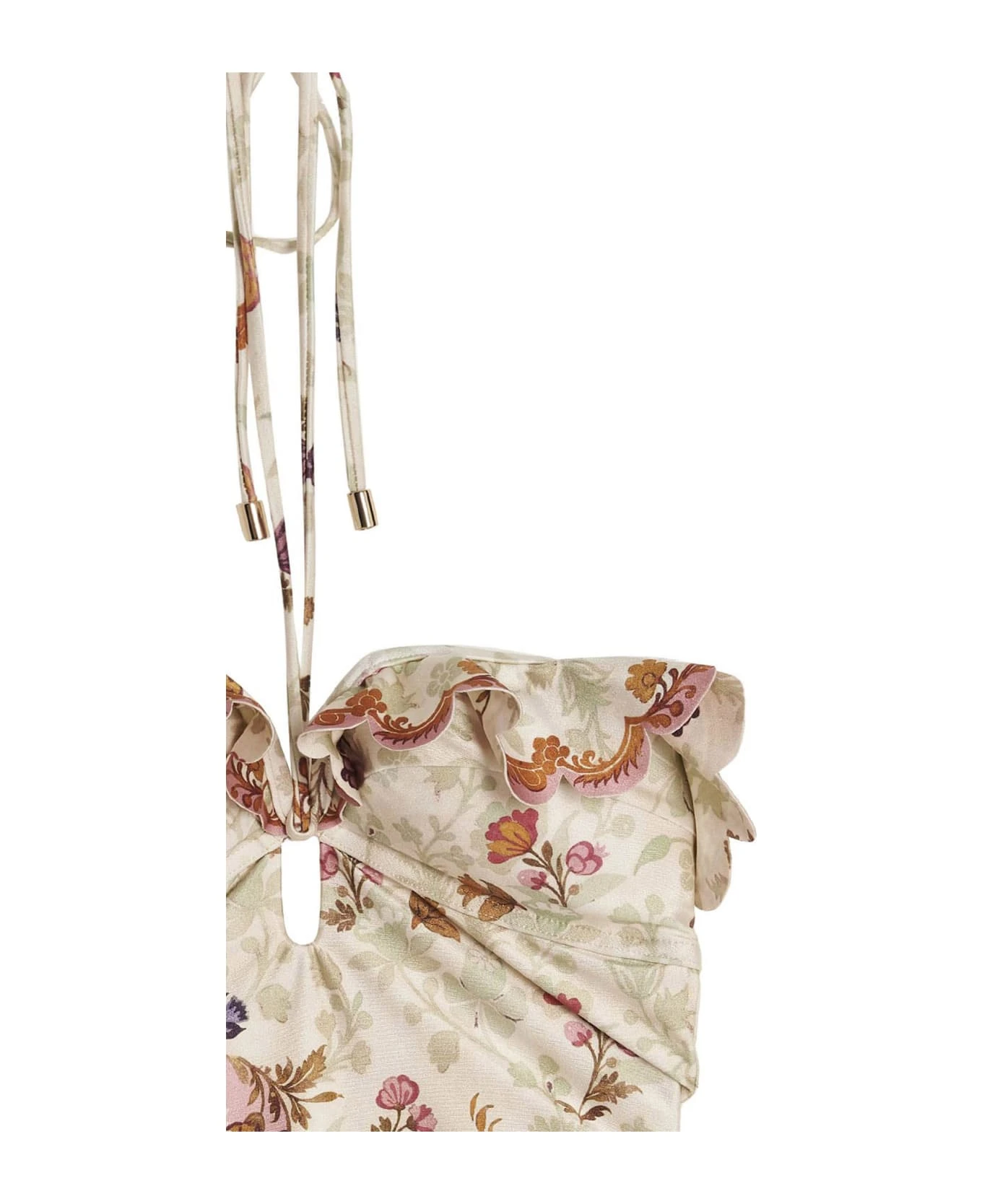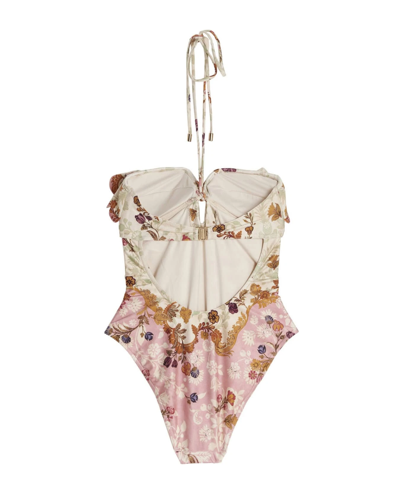 One-piece swimsuit ‘Laurel Wire Frill Halter’ in all-over floral print technical fabric, hook closure on the back, off the shoulder model, underwire in the cups, front lanyard.
